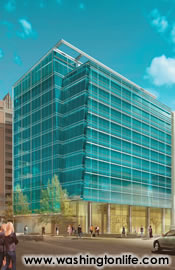 | The exterior of 1050 K, a 140,000 square foot office building designed by Hickok Cole Architects. It features a green roof and bio rentention system that collects water and feeds the landscaping |