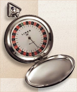 Roulette pocket watch: Now you no longer have to guess what time it is, or what your lucky number is. Thisfully functional watch reflects not only the comeback of yourgrandfather’s pocket watch, but also the omnipresence of allthings related to casinos. Only ten years old, “Links ofLondon,” has made a worldwide presence for itself by combining sensible Britishdesigns with playful colors and fashions. $190.www.vivre.com. |