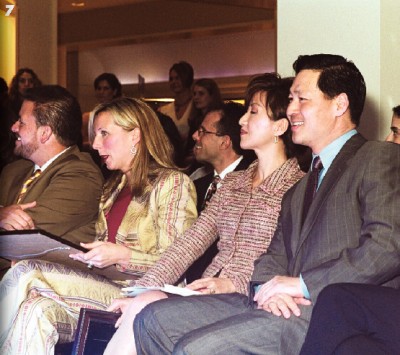 | Singular Men What do a football legend, a baker, and acongressman have in common? All were amongthe recipients of Washington Life's 2nd AnnualMen of Substance and Style Award. The eveningevent at Saks Fifth Avenue's Tysons CornerGalleria store on April 6 featured a fashionshow, silent and live auctions, and an array ofdelectable dishes from top local restaurantslike Chef Geoffs, The Landmark, Marcel's,Ristorante Tosca, Cities, Ten Penh, Ortanique,Blackie's, Cafe Milano, Sesto Senso, TeatroGoldoni, Lebanese Tavern, Dish Caterers, andFinn and Porter. Chili Amar of Mix 107.3 keptthe live auction lively, goading MicroStrategyCEO Michael Saylor, who was bidding on astay at Musgrove Plantation, "Oh. Come on.Surely You can go higher than that!" And hedid. WRC-4 anchor James Adams (substitutingfor Barbara Harrison.) ably emceed the awardspresentation. The event raised over $50,000 forVVAF's Campaign for a Landmine Free Worldand its Sports for Life program. |  Lanah Hamilton & Tanner Cambell Barbara Groshans