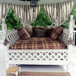 and a burro. Mrs. Groom employed Julie Hodgess, her friend and decorator, to give the home what she descibes as a Victorian feel with Edwardian flavor. In addition to her "country barefoot home" which Mrs. Groom describes as "an eclectic place" filled with "paintings of creatures," her estate also has two quaint guest houses known as The Barn and The White Rooster Cottage. Both have a fireplace, are charmingly decorated, and can comfortably accommodate several overnight guests. The Barn even has a pool table and a summer kitchen on the back porch, ideal for breakfasting while enjoying the view. Besides the residential structures, the grounds also boast a swimming pool; a pier; and an extensive network of winding riding trails, a fox den on the point, and a graveyard dating back to 1730. There is also a "memory garden" and a "poetry shed," both of which epitomizes the peace and tranquillity of the Eastern Shore. The poetry shed is a particular favorite among overnight gruests. Sometimes after dark they enter the small shed through an old Greek revival doorway entwined with honeysuckle to read from an extensive collection of verses. Illuminated only by candles and lanterns, the poetry shed is a magical setting in which to share one's views on life, love, and mortality. So secluded is the property that Mrs. Groom cannot see another light from her private estate, but she can hear the cacophony of night creatures in the land, air and water. Her summer bedroom with its gazebo and balcony is her favorite place in the house and the ideal venue for experiencing nature's nocturnal noises. Visitors to the estate can also expect to hear the soothing strains of classical music wafting on the summer breeze as each evening and every morning Mrs. Groom's horses dine to selections from the Masters. The horses also like blue grass music, she says, but "they don't like rock 'n roll," perhaps because it is less conducive to the sense of serenity they have come to expect at Mineral Springs Farm.