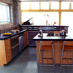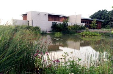 walls of the residence and the effect is extraordinary. Sorg purposely gave the vacation house an industrial appearance so that it would contrast sharply with van Sweden's traditional Georgetown home. And indeed the two residences could not be more different. Consequently, "It took me two years to get used to it," van Sweden admits. Accustomed to living in a dark narrow townhouse, "I felt quite exposed in a house with 60-feet of glass and seventeen foot ceilings," "no draperies," and nothing but "mesh shades" as window dressings. The concrete and glass compound is perfectly situated on three acres on the Chesapeake Bay's Ferry Cove, which van Sweden purchased because "its flat landscape" reminds him of his native Holland. He also chose the Eastern Shore because after ten years of owning an Atlantic beachfront home in Rehoboth, he had tired of the ocean's "hostile" environment, preferring a place where the physical forces of nature are more subdued. On the scenic shores of the Chesapeake it takes the vision and skill of an artist and the expertise of an experienced horticulturist to improve upon nature's beauty. But, that is exactly what James van Sweden and his partner, Wolfgang Oehme, of Oehme, van Sweden & Associates, Inc., have done. By applying their principles of "The New American Garden," a landscape style that uses indigenous and existing plants to create a new "gardenscape," they have taken the Eastern Shore's pristine beauty and amplified it to create a meadow-like garden of sea grass and dune wheat. (Perhaps this is why Oprah Winfrey chose Van Sweden to design the grounds of her estate.) To add drama to the garden, van Sweden's planted a large grouping of Sylphium. Now nine-feet tall and in full bloom, their bright yellow daisy-like flowers mimic the warmth and well-being one naturally feels on a sunny summer day at the shore. Elsewhere, van Sweden added interest and shade with the artful placement of several native trees, including blackberry, magnolia, alder and persimmon. Obviously, the home's exterior both showcases and inspires van Sweden's talents as a landscape architect, but the home's interior is also conducive to his creative endeavors. His recently released "Architecture in the Garden" was largely composed in the comfortable confines of his country abode and he is currently working on his newest book tentatively titled, "The Arts Inspire The Garden," here as well. His interior décor is simple as well. He is, "a minimalist" who when it comes to furniture, prefers none. What furniture he does have is highly. He doesn't even have all the standard household appliances most people consider necessities. For example, he "doesn't have a refrigerator." Rather, he has four unobtrusive Sub Zero refrigerator and freezer drawers. His favorite room is the living room where he displays the work of modern artists and plays his grand piano for his own enjoyment. He has a strong preference for the screened-in front porch which he likens to his grandmother's front porch at her cottage on Lake Michigan, where he summered as a child. A white driftwood gazebo constructed by Ben Forgey, the son of the Washington Post's architectural critic, is another choice locale. Here at the water's edge van Sweden can often be found enjoying a sunset and a scotch. Flood-lighted at night, the ghostly gazebo rivals the house itself as an architectural focal point worthy of admiration and calls one's attention to the vast expanse of "gardenscape" between. In the summer van Sweden closes his office early each Friday, and, when not