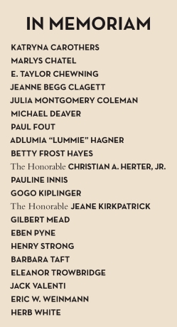 Mr. and Mrs. WILLIAM HOWARD TAFT, IV (Julia) Mrs. WWAVERLY TAYLOR (Edmee) Mrs. DANIEL J. TERRA (Judith) Mr. and Mrs. EVAN THOMAS (Oscie) Mr. and Mrs. PHILIP THOMAS (Patti) Mrs. BENJAMIN W. THORON (Violet) Mr. and Mrs. WILLIAM R. TIEFEL (Norma Kline) Mr. and Mrs. MAURICE B. TOBIN (Joan) Mr. and Mrs. VLADIMIR S. TOLSTOY (Suzanne) Mr. and Mrs. STEPHEN J. TRACHTENBERG (Francine) Mr. GEOFF TRACY and Ms. NORAH O'DONNELL Mr. and Mrs. MICHAEL TRAEGER (Marietta) Mr. and Mrs. BOWDOIN C. TRAIN (Georgia) Mrs. MARJORIE LEGARE HARDY TRAIN The Honorable and Mrs. RUSSELL E. TRAIN (Aileen) The Honorable and Mrs. JOSEPH DAVIES TYDINGS (Kate)