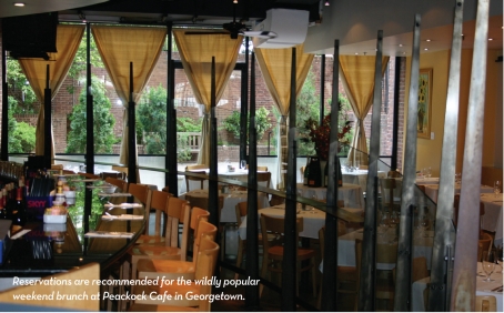 On a recent Saturday morning, the scene at Peacock Cafe was soo chic that we have to give it a nod. The crowd ran the gamut, from regulars like Tommy Quinn and Michael Saylor to ambassadors, Bush appointees and hip young nightlifers. It's no wonder they have recently opened a second restaurant, Peacock Grand Cafe downtown, complete with lunch and dinner for the K Street crowd and an even greater selection of wine and spirits. Peacock Cafe; 3251 Prospect Street NW; 202-625-2740; Peacock Grand Cafe; 2020 K Street NW; 202-530-2020 The newly restored and refurbished St. Regis Washington D.C. offers a Valentine's Day escape for couples.