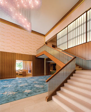 main building by a traditional wooden and redcarpeted