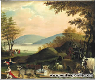 For folk art aficionados, the most coveted painting that could be added to a collection would certainly be one of the Peaceable Kingdom paintings by Edward Hicks, who is considered by art historians to be the greatest and possibly most influential American folk artist. Born in Buckstown, Pennsylvania, Hicks was a popular Quaker minister who also came to have a successful ornamental painting business decorating coaches, signboards, furniture and decorative household objects. His first easel painting was a composition called The Peaceable Kingdom and he went on to do over 65 different variations on that particular subject during his life. Although he also painted historical compositions such as Washington crossing the Delaware and the Indians signing the Penn Treaty, the popular Peaceable Kingdom paintings became a looking glass into the schism that plagued the Quaker community and concerned Hicks who was, above all else, a religious man who embraced the idea that peace in the world was possible.