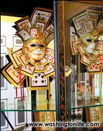 | Displayed in the foyer, a Venetian mask set with playing cards symbolizes Nuschese's roots in Italy and Las Vegas. |
