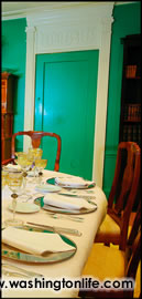 The dining room, painted bright green by the previous owners, centers on a long table and Queen Anne-style chairs. |