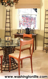 Ireland, who attended Montgomery College but never graduated, admits he is still developing his style, which draws on both the traditional and the modern. "I like mixing history with pieces that are contemporary," he says, "but not so contemporary that they feel out of place." Inspiration, he adds, comes from the work of New York designer John Saladino and Washington über-decorator Thomas Pheasant. The "tone-ontone" look of their interiors, created through a subtle layering of textures and colors, is certainly evident in Ireland's beige-on-taupe room at the Washington Design Center (on view through June 24), where cushy armchairs and a sofa from Gore-Dean are paired with a metal coffee table filled with pebbles.