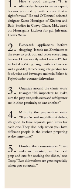Across the hall in a smaller bedroom, the nursery continues the pale look with white cribs fitted with Picci baby linens. Pillows embroidered with the twins’ names and birthdates are a gift from NBC’s Tim Russert, host of Meet the Press. Back in the kitchen after the tour, Tracy buttons his chef ’s jacket and reflects on the renovation before leaving for work. The kitchen is clearly his domain but he relates that his wife drove much of the home’s redesign. “I was told about everything after it was purchased and installed,” he laughs. Tracy is obviously pleased with the results, especially the way all the ground-floor rooms now connect around the center hall to the kitchen. “It will make a nice running track for Grace and |