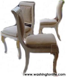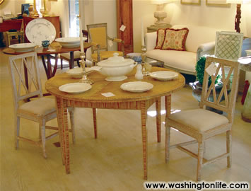 This circa 1810 SWEDISH PAINTED TABLE can be split in two. It’s actually a pair of demi-lune side tables. Flanking the table are two 18th century Swedish Gustavian side chairs. Available at Marston Luce on Wisconsin Avenue, in Georgetown. (202) 333-6800 |