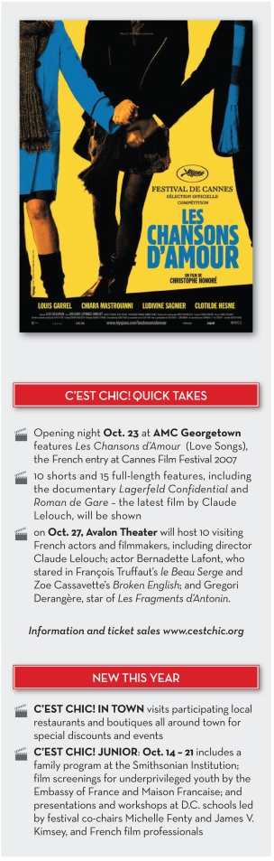 Imet the very charming C'est Chic D.C. French Film Festival founder, Lysbeth Sherman just a few minutes after the final frame of La Vie En Rose when it premiered this spring at the Lincoln Theatre as the opening night entry of Filmfest D.C. The audience jumped to their feet and cheered this stirring celebration of the art and life of singer Edith Piaf. I glanced at the lady next to me and said, "What a wonderful movie!" Ms. Sherman smiled and informed me she had planned several nights of similarly wonderful films for the D.C. French Film Festival, and that I should participate. No man in his right mind turns down a request from a charming French woman, and no film lover passes up a chance to see the latest from the always exuberant French film industry. "Count me among those present," I responded.