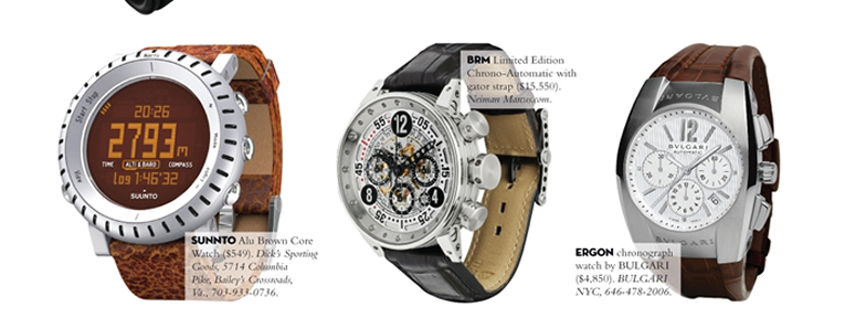 Gentlemen, watch out for modern updates of classic timepieces. This fall, even Rolex watches have had a (larger, bolder) facelift. For a trendier look, BRM has designed an urban, cutting edge timepiece that's sure to get noticed. And nothing says "au courant" quite like Panerai's Lumior. Modern, classic or sporty — choose a timepiece that fits your style. |