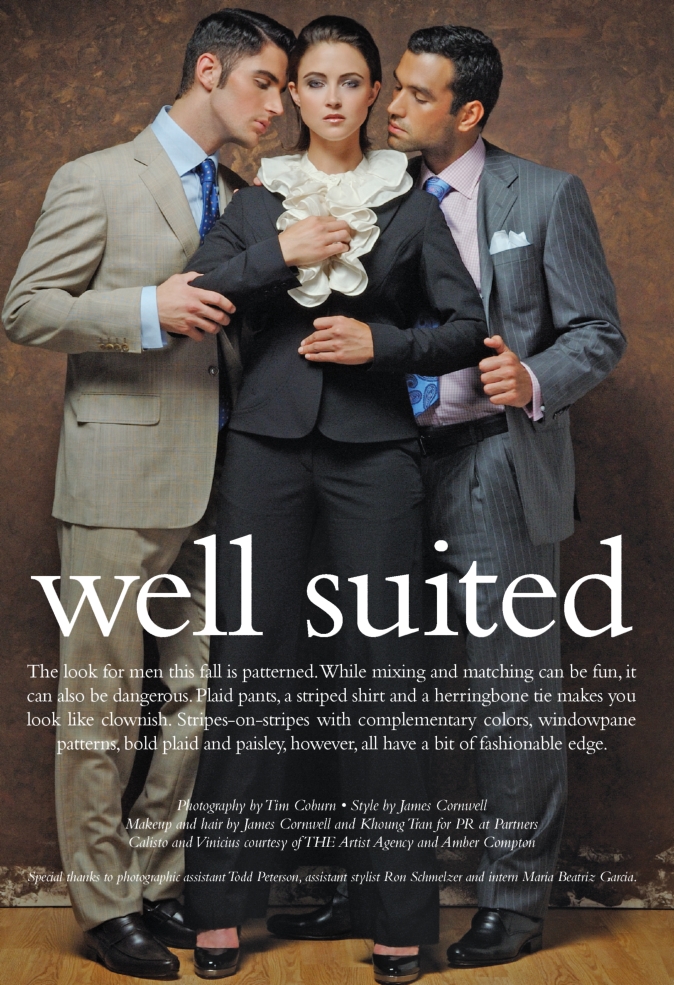 LEFT: ERMENEGILDO ZEGNA brown plaid suit ($1,250), BRANDOLINI textured blue shirt ($275) and blue flower and circle tie ($135). All available at Professional Man Prima Moda, 1619 K St. NW 202-4666255. RAPTURE brown shoes ($280). From Reiss Washington, 1254 Wisconsin Ave. NW, 202-944-8566. CENTER: NESSA black suit pant ($225) and suit jacket ($400), FRUFRA cream shirt ($210) and DELANO black shoes ($325). All available at Reiss Washington, 1254 Wisconsin Ave. NW, 202-944-8566. RIGHT: HICKEY FREEMAN COLLECTION grey pin stripe suit ($1,545), ASTER pink plaid shirt ($265) and HOLIDAY AND BROWN paisley tie ($160). All available at Everard's Fine Clothing, 1802 Wisconsin Ave. NW 202-298-7464. TRIUMPH brown dress shoes ($200). Available at Reiss Washington, 1254 Wisconsin Ave. NW, 202-944-8566. ZEGNA brown plaid suit ($1,250) and BRANDOLINI textured blue shirt ($275) with blue flower and circle tie ($135). All from Professional Man.