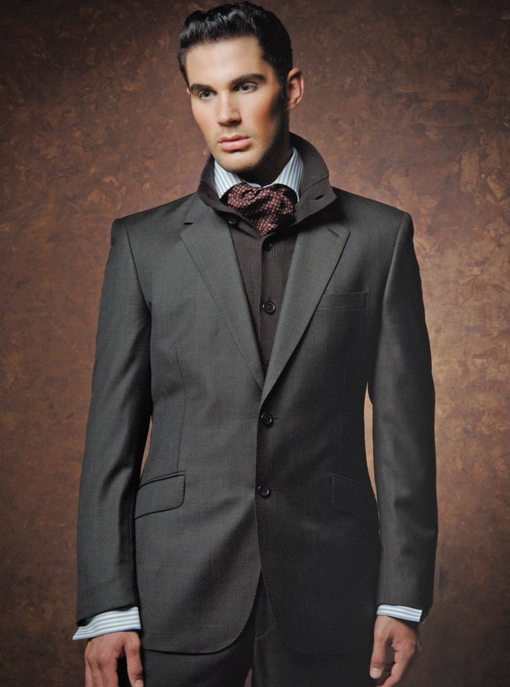 PRESTIGE brown suit ($855) and HARRISON brown sweater ($200). From Reiss Washington, 1254 Wisconsin Ave. NW, 202-944-8566. ASTER striped shirt ($265) and PRIMA MODA patterned ascot ($125). From Professional Man Prima Moda, 1619 K St. NW202-466-6255.