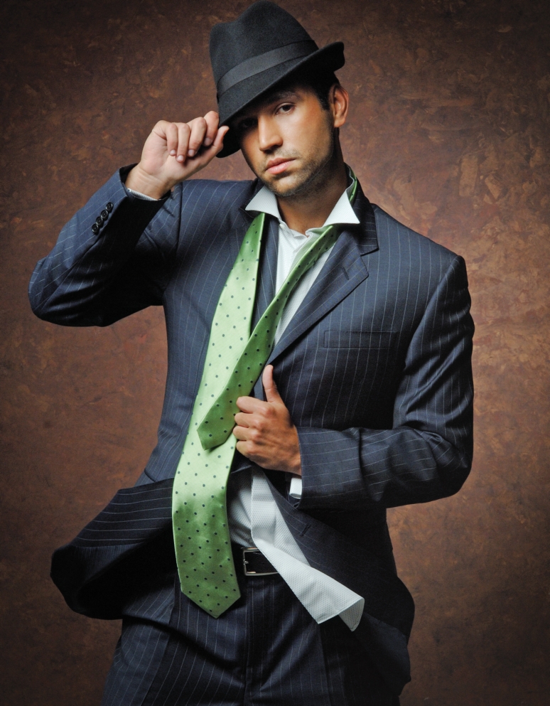 HICKEY FREEMAN blue pin stripe suit ($1,545), ASTER shirt ($265), HOLLIDAY AND BROWN polka dot tie ($160) and STEFANO PIAZZA black textured belt ($125). All from Everard's Fine Clothing, 1802 Wisconsin Ave. NW202-298-7464. MARLENE black hat ($90),