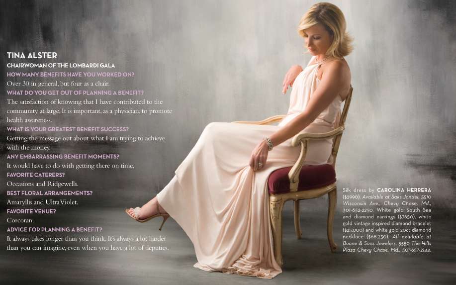 TINA ALASTER HOW MANY BENEFITS HAVE YOU WORKED ON? Over 30 in general, but four as a chair. WHAT DO YOU GET OUT OF PLANNING A BENEFIT? The satisfaction of knowing that I have contributed to the community at large. It is important, as a physician, to promote health awareness. WHAT IS YOUR GREATEST BENEFIT SUCCESS? Getting the message out about what I am trying to achieve with the money. ANY EMBARRASSING BENEFIT MOMENTS? It would have to do with getting there on time. FAVORITE CATERERS? Occasions and Ridgewells. BEST FLORAL ARRANGEMENTS? Amaryllis and Ultra Violet. FAVORITE VENUE? Corcoran. ADVICE FOR PLANNING A BENEFIT? It always takes longer than you think. It’s always a lot harder than you can imagine, even when you have a lot of deputies. Silk dress by CAROLINA HERRERA($2990). Available at Saks Jandel, 5510 Wisconsin Ave., Chevy Chase, Md., 301-652-2250. White gold South Sea and diamond earrings ($7650), white gold vintage inspired diamond bracelet ($25,000) and white gold 20ct diamond necklace ($68,250). All available at Boone & Sons Jewelers, 5550 The Hills Plaza Chevy Chase, Md., 301-657-2144. |