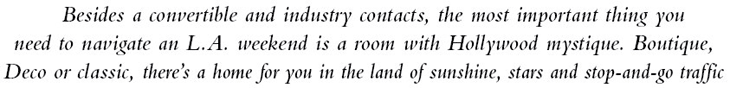 DESIGN: The lobby and restaurant are Art Deco fab, with daring lamps and lavishly tiled floors; the rooms are more peacefully walled in muted blues, grays, greens and whites. ROOMS: 112 rooms and suites. AMENITIES: A rooftop pool with billowy Arabian nights cabanas and a hot Hollywood view will charm the most jaded of travelers. RESTAURANT: The Atrium Restaurant is sun-drenched by day but becomes a dimly-lit intimate bistro at night. Get there: 1000 Westmount Dr., West Hollywood, 310-657-7400, www. chamberlainwesthollywood.com |